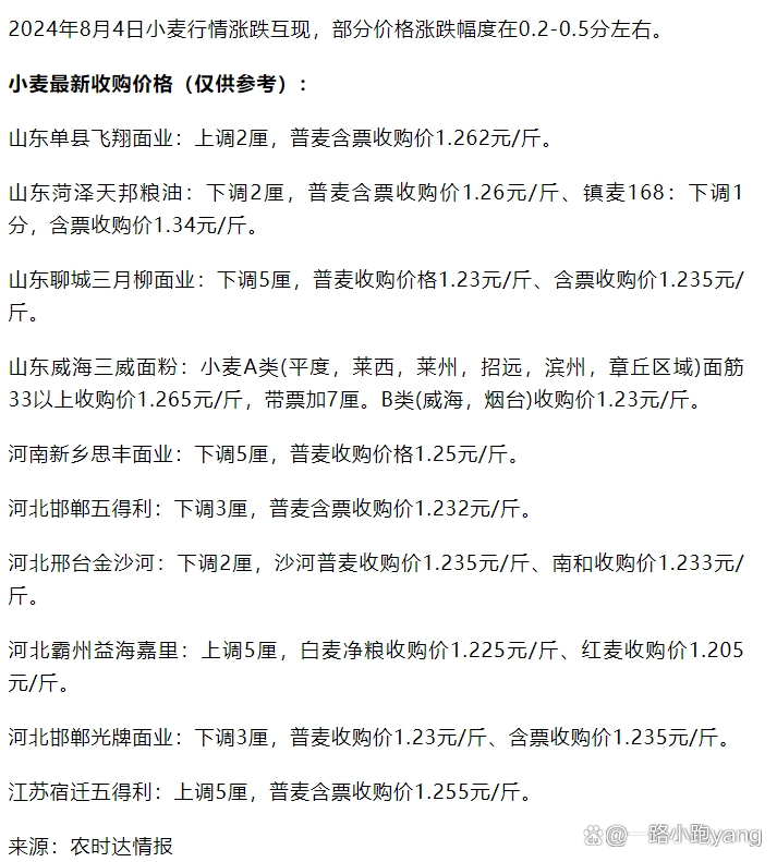 随着全球经济的复苏,农业市场的活跃度持续上升,作为重要的粮食作物,小麦的市场行情备受关注,据最新数据显示,2024年小麦价格整体呈现稳中有升的态势,从年初至今,小麦价格一直保持着稳定的增长趋势,市场供需关系基本平衡。